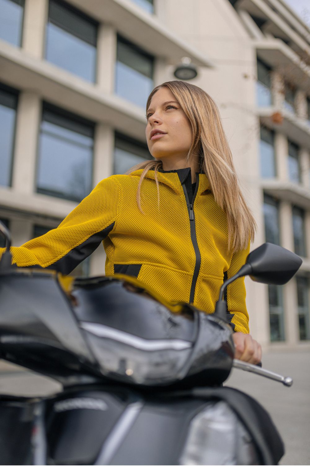 Chaqueta de mujer de corte bomber, certificada moto CE - Clase AA, realizada en malla 3D con insertos en softshell ligero. Las protecciones removibles EASYFLEX CE en los hombros y codos son tan ligeras y ventiladas que no se sienten ni se ven. En perfecto equilibrio entre seguridad y estilo.