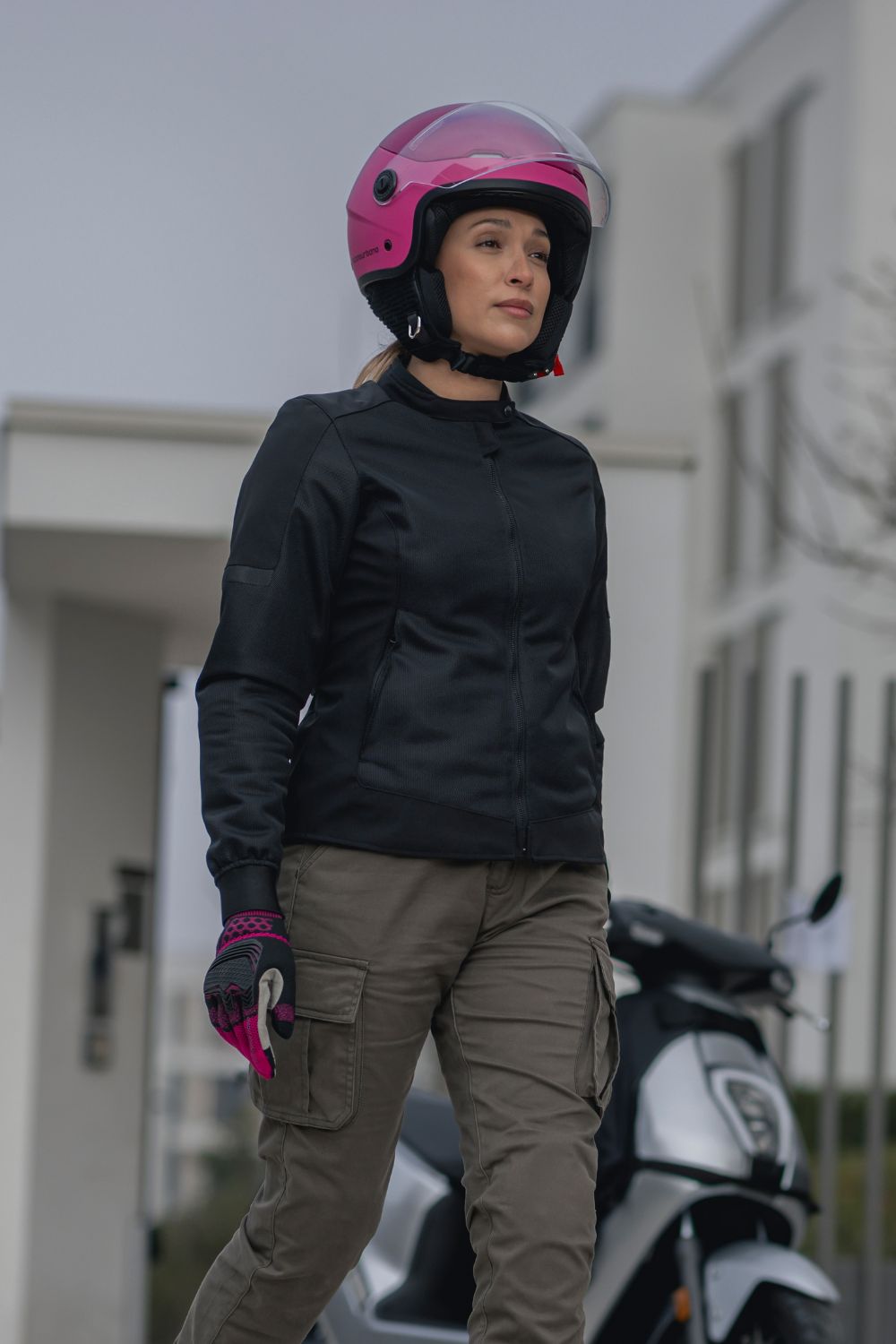 Chaqueta de mujer de corte motociclista moderno, certificada moto CE - Clase A, realizada en malla con insertos en softshell. Las protecciones removibles COMFORT PROTECTION SYSTEM en los hombros y codos son tan ligeras que no se sienten ni se ven. En perfecto equilibrio entre seguridad y estilo.