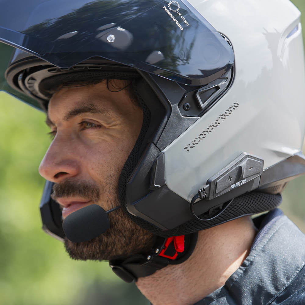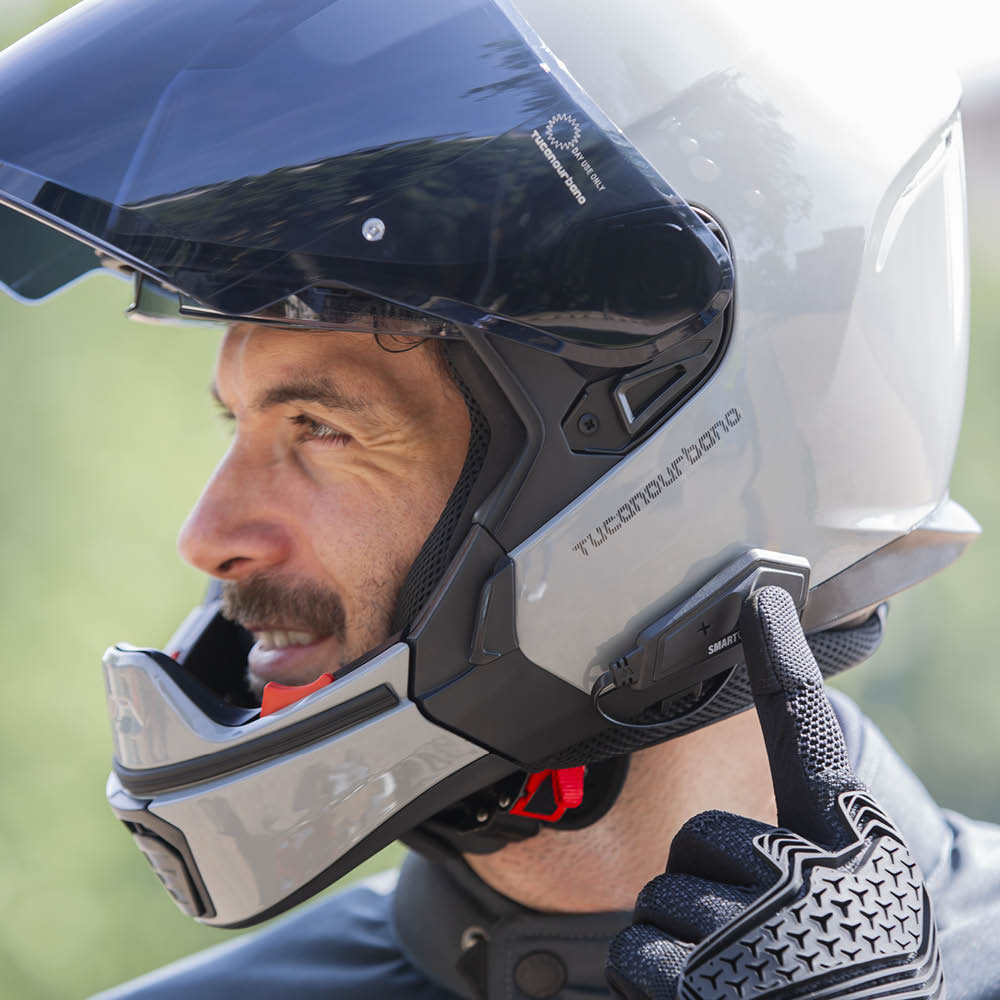 Casco moto integrale urbano in policarbonato, omologato P/J ECE 22.06: ha l'interfono by Midland® integrato per smaltire le telefonate durante gli spostamenti, la mentoniera removibile per riporlo nel sottosella o nel bauletto e la visiera ultrawide per intercettare i pericoli sempre in agguato in città.