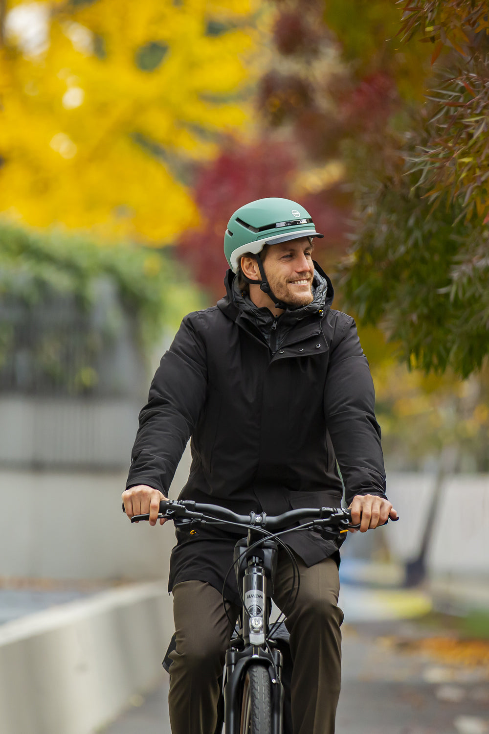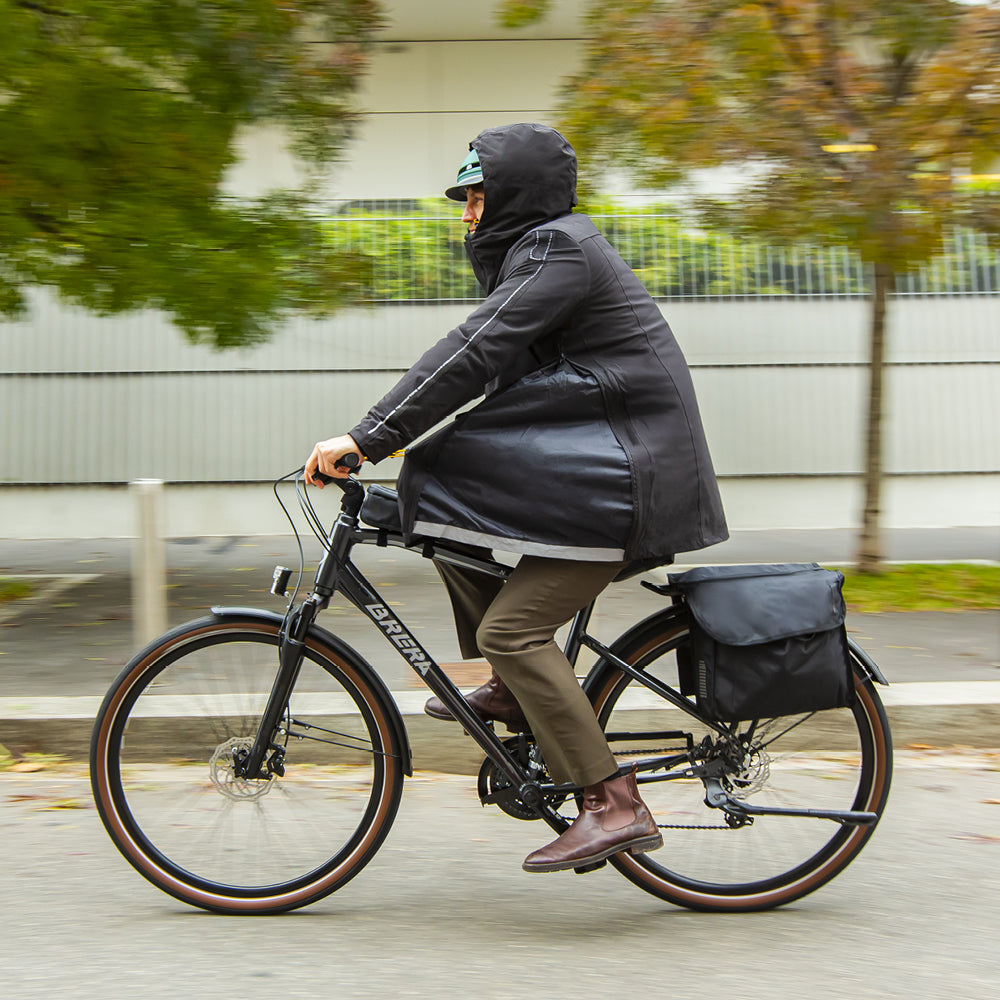 Parka di taglio ¾, trasformabile in mantella-coprigambe antipioggia da bicicletta.