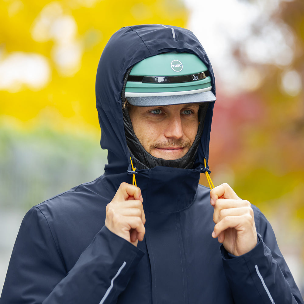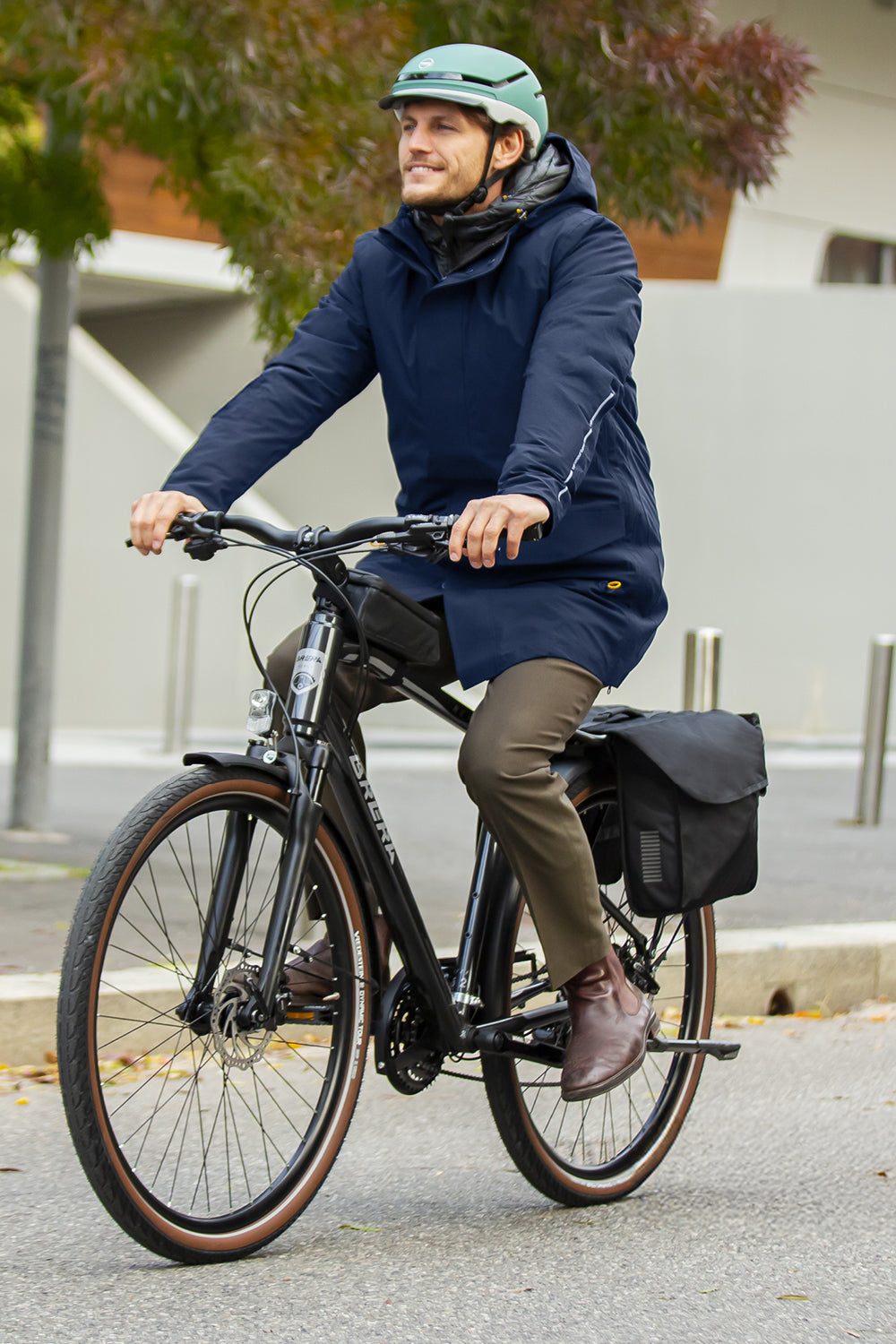 Parka di taglio ¾, trasformabile in mantella-coprigambe antipioggia da bicicletta.