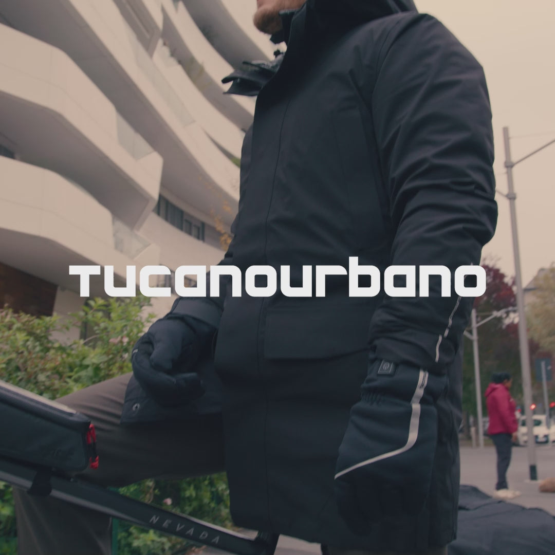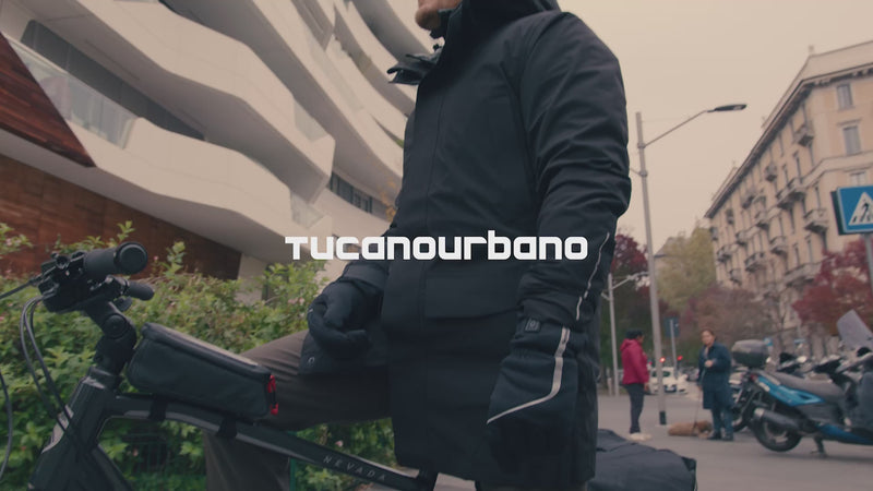 Parka donna di taglio ¾, trasformabile in mantella-coprigambe antipioggia da bicicletta.
